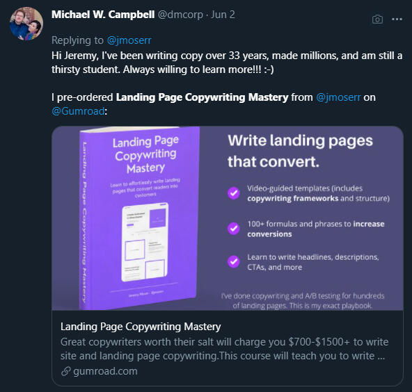 Take this course, write a landing page using these walkthroughs, and that same landing page will convert 114+ users.